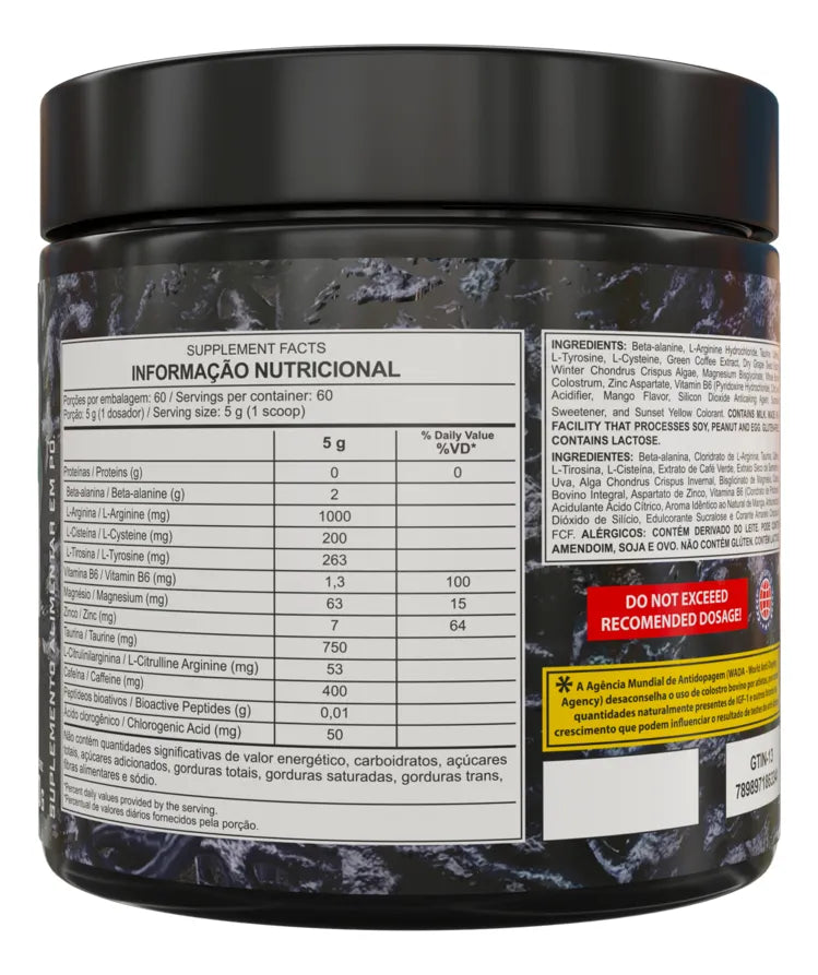 Ingredientes: Beta Alanina, L-Arginina, Taurina, Colostro Bovino em Pó, Cafeína, Cisteína, L-Tirosina, N-Acetil L-Metionina, Ácido Ascórbico, Extrato de café verde, Extrato seco de semente de uva, Alga Chondrus Crispus Invernal, Bisglicinato de Magnésio, Zindo Aspartato, Vitamina B6 (Cloridrato de Piridoxina), Aroma Idêntico ao Natural de Frutas Vermelhas, Corante Vermelho de Beterraba, Acidulante ácido Cítrico, Edulcorante Sucralose. Alérgicos: PODE CONTER AMENDOIM E DERIVADOS DO LEITE, DA SOJA E DO OVO*. NÃO CONTÉM GLÚTEN.*Fabricado em uma instalação BPF que processa outros produtos que contém esses alergênicos. Aviso legal • Idade mínima recomendada: 18 anos. • Consumir junto com alimentos para facilitar sua assimilação. • Este produto é um suplemento dietético, não um medicamento. Suplementa dietas insuficientes. Consulte o seu médico e/ou farmacêutico.