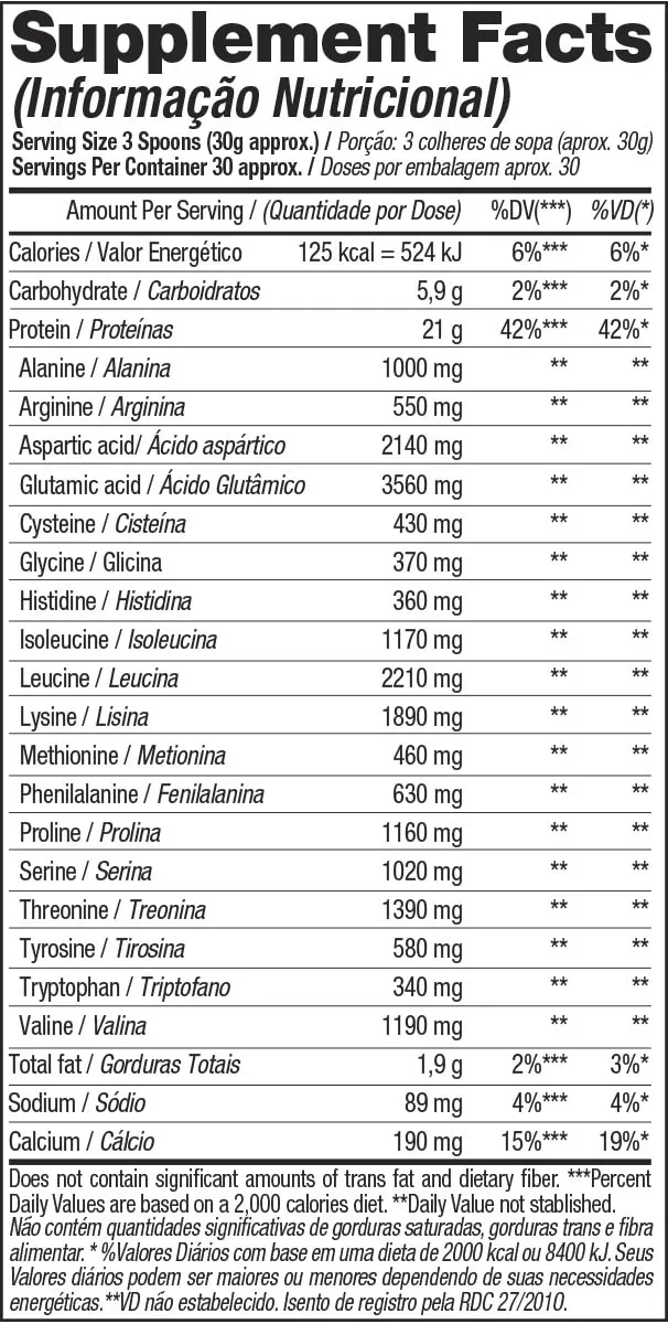 Whey 100% HD é um suplemento avançado da linha caveira preta, composto por três tipos de whey protein: concentrado, isolado e hidrolisado. É uma excelente escolha para auxiliar no aumento de massa muscular. A fórmula também inclui BCAA, aminoácidos de cadeia ramificada que ajudam na recuperação pós-treino. Benefícios: - 3W (isolado, concentrado e hidrolisado) - Contribui para o aumento de massa muscular; - 4,5G de BCAA'S por dose; - Sem glúten; - Alto valor biológico; - SRO - processo de refinação que utiliza pressão da água para remover contaminantes, forçando as moléculas através de uma membrana semipermeável. Ingredientes: Proteína concentrada do soro do leite, proteína isolada do soro de leite, proteína hidrolisada do soro do leite, l-leucina, l-isoleucina, l-valina, aromatizante, espessante goma xantana, corante vermelho beterraba, acidulante ácido cítrico, edulcorantes sucralose e acessulfame de potássio. ALÉRGICOS: CONTÉM DERIVADOS DO LEITE. PODE CONTER AMENDOIM E DERIVADOS DE SOJA, OVO E TRIGO. CONTÉM LACTOSE. NÃO CONTÉM GLÚTEN. Sugestão de uso: Misture 3 colheres de sopa (aprox. 30g) de Whey 100% HD em 150 ml de água, ou ajuste a consistência conforme desejado, e consuma uma vez ao dia ou conforme orientação de um profissional especializado. Recomendado para adultos acima de 19 anos de idade. Aviso legal • Idade mínima recomendada: 19 anos. • Consumir junto com alimentos para facilitar sua assimilação. • Este produto é um suplemento dietético, não um medicamento. Suplementa dietas insuficientes. Consulte o seu médico e/ou farmacêutico.