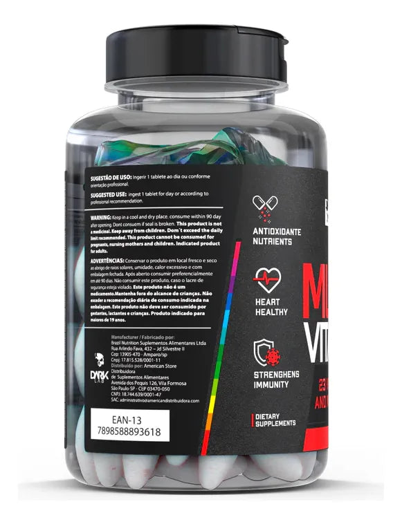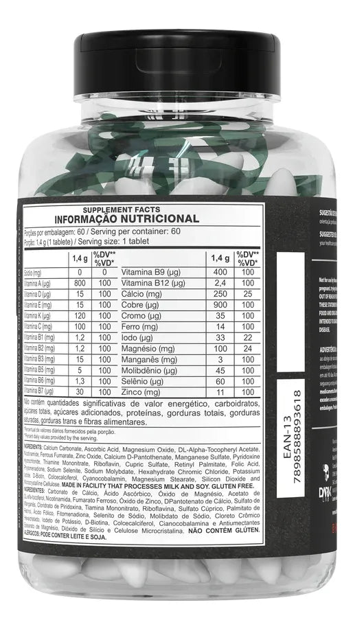MULTIVITAMIN é uma fonte de nutrientes essenciais para uma rotina saudável. Os benefícios ajudam com a prática de atividades físicas, garantindo que você tenha sempre em mãos os melhores nutrientes para a recuperação pós-treino e a disposição de treinar cada vez melhor. SUGESTÃO DE USO Consumir 1 tablete ao dia, preferencialmente junto com uma das refeições. INGREDIENTES Carbonato de cálcio, óxido de magnésio, ácido ascórbico, nicotinamida, fumarato ferroso, óxido de zinco, acetato de tocoferol, ácido pantotênico, sulfato de manganês monohidratado, piridoxina, riboflavina, tiamina, sulfato de cobre anidro, palmitato de retinol, ácido fólico, molibdênio de sódio dihidratado, cloreto de cromo hexahidratado, iodeto de potássio, biotina, fitomenadiona, selenito de sódio, colecalciferol, cianocobalamina, dióxido de silício, estearato de magnésio, glicolato amido sódico, celulose microcristalina, maltodextrina. Veículo cápsula: gelatina, água purificada, corantes artificiais (amarelo crepúsculo e vermelho allura), e corante inorgânico dióxido de titânio. CONSERVAÇÃO Conservar este produto bem fechado, em lugar fresco e seco, protegido dos raios solares. Depois que aberto, consumir preferencialmente em até 30 dias. ADVERTÊNCIAS Crianças, gestantes, idosos e portadores de qualquer enfermidade devem consultar o médico e/ou nutricionista. Este produto não substitui uma alimentação equilibrada e seu consumo deve ser orientado por um nutricionista e/ou médico. Aviso legal • Idade mínima recomendada: 18 anos. • Consumir junto com alimentos para facilitar sua assimilação. • Este produto é um suplemento dietético, não um medicamento. Suplementa dietas insuficientes. Consulte o seu médico e/ou farmacêutico.